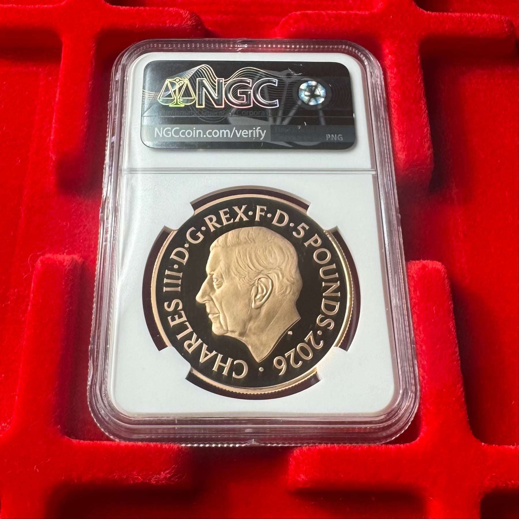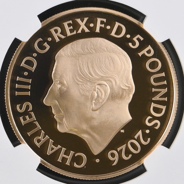 本商品は、2026年に発行された英国 5ポンド金貨であり、「Portraits of a Queen」シリーズに属する第一肖像(First Effigy)の1枚です。