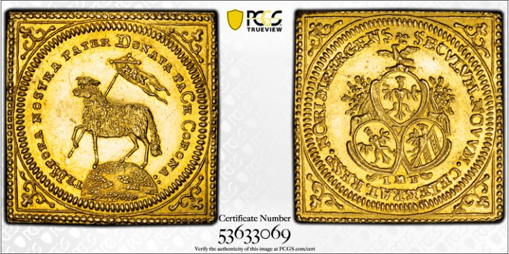 貴重な1700年発行のヌルンベルク ダカット クリッペは、羊が地球を歩むというユニークなデザインが際立っています。羊が掲げている旗には「PAX(平和)」という言葉が刻まれており、これは平和の象徴として知られています。このデザインは、神聖ローマ帝国時代の自由都市として、ニュルンベルクがその経済力と文化的繁栄を誇り、そして平和と繁栄を願っていたことを表しており、歴史的価値の高い一枚です。